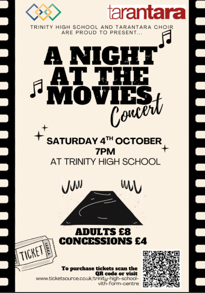 Trinity High School and Tarantara Choir are proud to present “A Night at the Movies” Concert on Saturday 4th October. This is a very exciting collaboration and will showcase the students of Trinity High School alongside the fabulous Tarantara Choir. This is not a night to be missed and tickets are now on sale. Please use the below the link:-