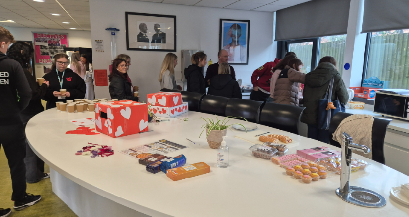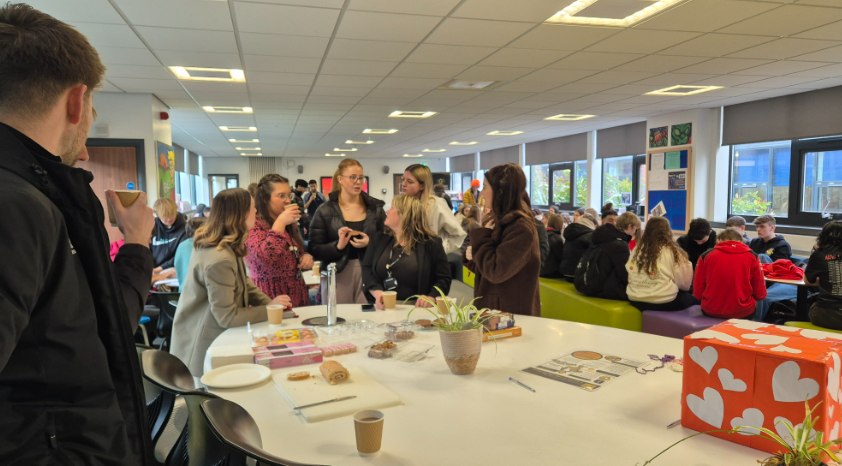 This Valentine’s Day, our Sixth Form Enrichment Team hosted “Flirty Friday” to raise money for Touchstones, a local charity supporting children through bereavement. Sixth Form students embraced the theme by wearing red or pink non-uniform and writing heartfelt notes to each other on red hearts during form time. At breaktime, they enjoyed delicious hot chocolates topped with whipped cream, marshmallows, and sprinkles, and could also purchase beautiful handmade crocheted hearts.