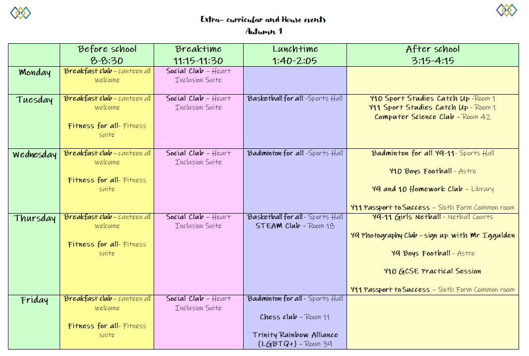 At Trinity High School we strive to offer a wide range of extra-curricular activities. The timetable for activities is shared weekly on our website, The Hub on TEAMS, Facebook, it is also sent to form tutors.