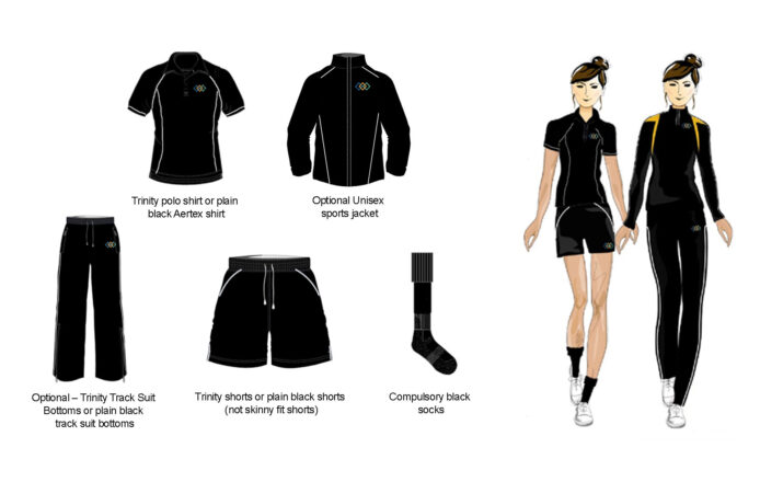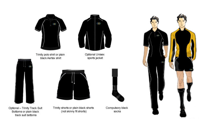 - At Trinity, we have a policy that only allows shoes that are formal, leather, black and polishable. For guidance, the type of shoe that would be worn with business attire or to a formal celebration. Nike Air Force or any other branded shoe will not be acceptable, largely down to the cost of the shoe, which contravenes the government affordability mandate.